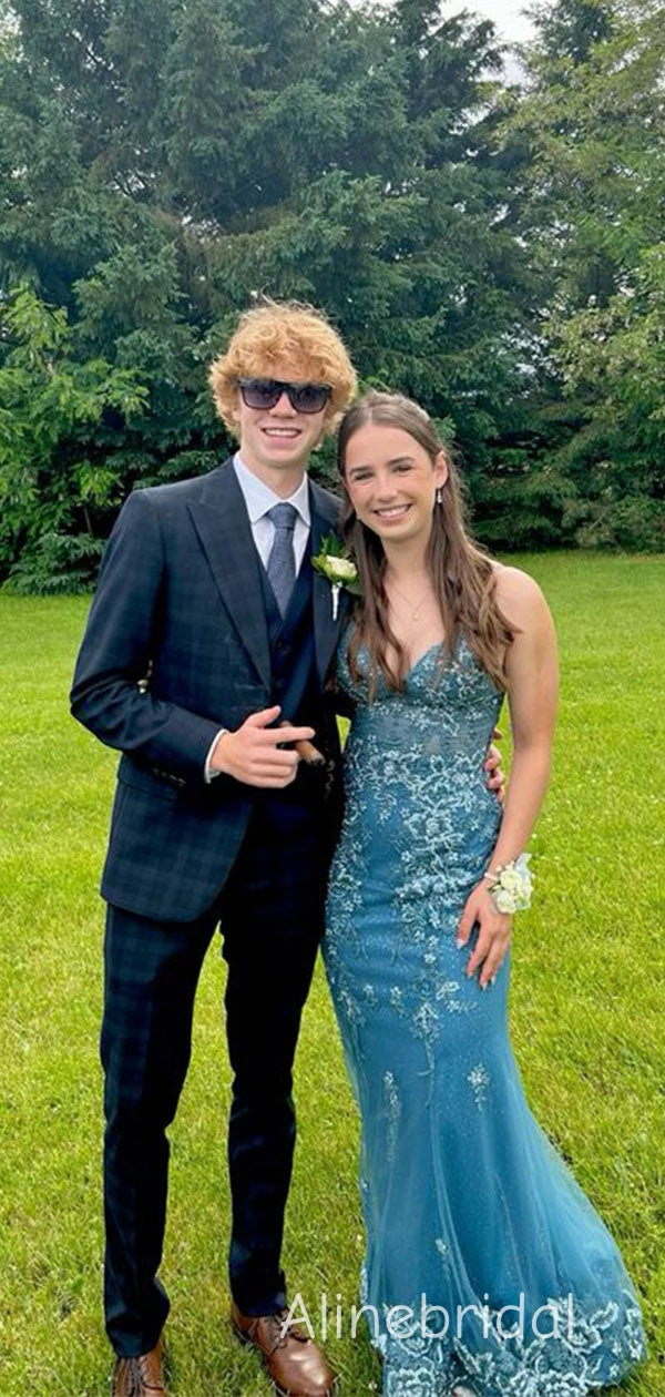 Elegant Blue V-neck Lace Applique Long Mermaid Tulle Prom Dress, Evening Dress, PD382290